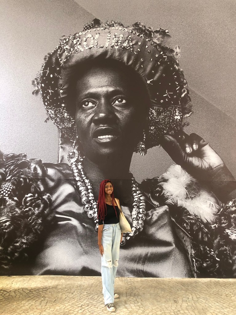 Nos arredores do museu, tanto no lado de fora quanto no de dentro, há imagens gigantes da Carolina, e esse fato logo me fez pensar: quantas mulheres com a cor e com traços como os de Carolina estão sendo celebradas em museus e outros espaços artísticos? É importante enfatizar que a primeira imagem da escritora, maximizada em uma parede, a apresenta de cabelos soltos, com brincos, roupa e adereços de festa, ou seja, o início perfeito de uma celebração.